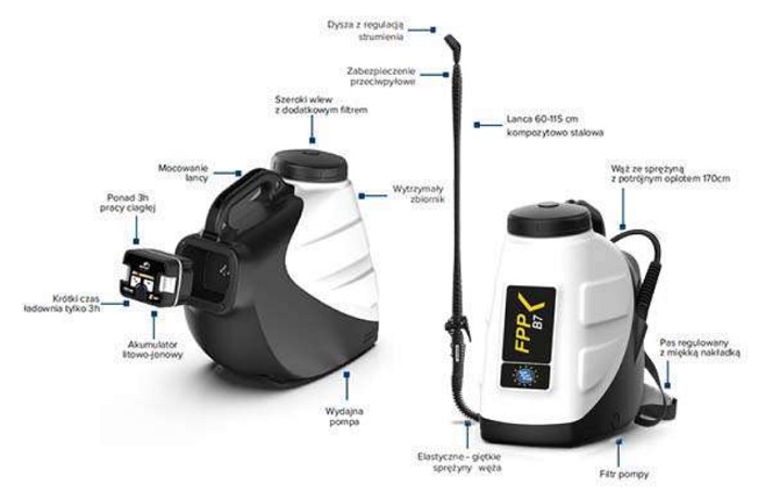 Opryskiwacz naramienny FPP-B7 o pojemności zbiornika 7 L, z akumulatorem litowo jonowym jest stosowany do dezynfekcji metodą zamgławiania.
